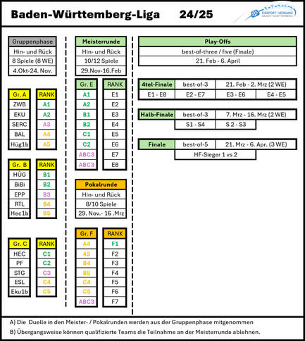 Was zunächst als Aprilscherz begann, hat bei den Vereinen im EBW nun die Zustimmung erhalten. Nach regem Austausch zwischen dem Verband und den Mannschaften wie der Modus umgesetzt werden kann, wurde nach dem Meldeschluss Anfang Juli - bei dem sich final 15 Teams für den Spielbetrieb im EBW-Seniorenbereich meldeten - folgender Modus erarbeitet. Diese Mannschaften spielen fortan in einer gemeinsamen Liga (Baden-Württemberg-Liga). Nach einer gemeinsamen Gruppenphase wird die Liga dann in den RL-Zweig (Meisterrunde) und LL- Zweig (Pokalrunde) geteilt.
